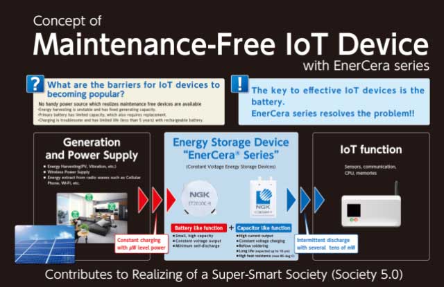 在去年的CES 2019上,NGK Insulators Ltd.NGK)的硬幣和郵袋類型“ EnerCera”系列榮獲CES創(chuàng)新獎(jiǎng)(在智能能源類別中)。隨著二次電池產(chǎn)品系列的推出,解決物聯(lián)網(wǎng)設(shè)備電池問題的期望越來越大。晶體取向陶瓷板僅由活性材料組成,在小而薄的主體內(nèi)實(shí)現(xiàn)了高能量密度和低內(nèi)阻。它還具有高溫安裝的獨(dú)特特性。EnerCera系列可以運(yùn)行需要大電流(例如,幾10 mA至幾100 mA)的IC,傳感器和無線通信系統(tǒng)。此外,CV(恒定電壓)充電功能消除了使用充電器IC控制充電電流的需要。EnerCera系列的定位是在不久的將來提供一次電池的替代產(chǎn)品。