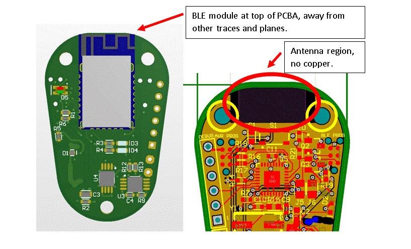 3.在藍牙芯片組或模塊中進行電路設(shè)計時,請使天線區(qū)域完全遠離附近的銅信號或承載大量能量的組件(尤其是經(jīng)過升壓或降壓轉(zhuǎn)換器切換的電源路徑)。