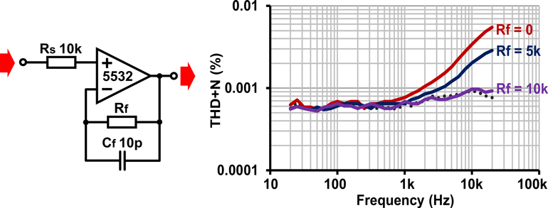 6.反相運算放大器級顯示沒有可測量的失真。未補償?shù)耐噙\算放大器級表現(xiàn)出共模失真,但是當Rs = Rf || R1Cs = Cf時,幾乎可以完全補償。虛線是測量平臺;在所有情況下均為14-dBu輸入。