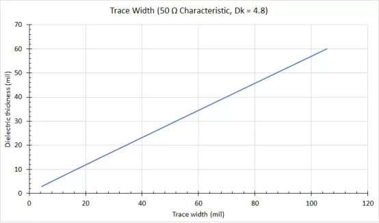 圖 2. Dk = 4.8襯底上特性阻抗為50歐姆時的電介質(zhì)厚度與走線寬度的關(guān)系。