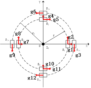 圖中紅色箭頭代表傳感器軸方向,內(nèi)圈4個(gè)雙軸HMC1022芯片,外圈4個(gè)HMC1021芯片。